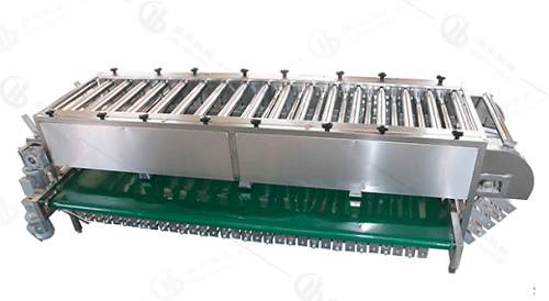The pear grading machine also features several functional enhancements that improve performance and hygiene. An alignment brush ensures that products are properly positioned, while an anti-lift system prevents rollers from being lifted by elongated products. Cleaning options include a brush, roll cleaning mat, or spray tube to keep the rollers clean and maintain smooth operation.